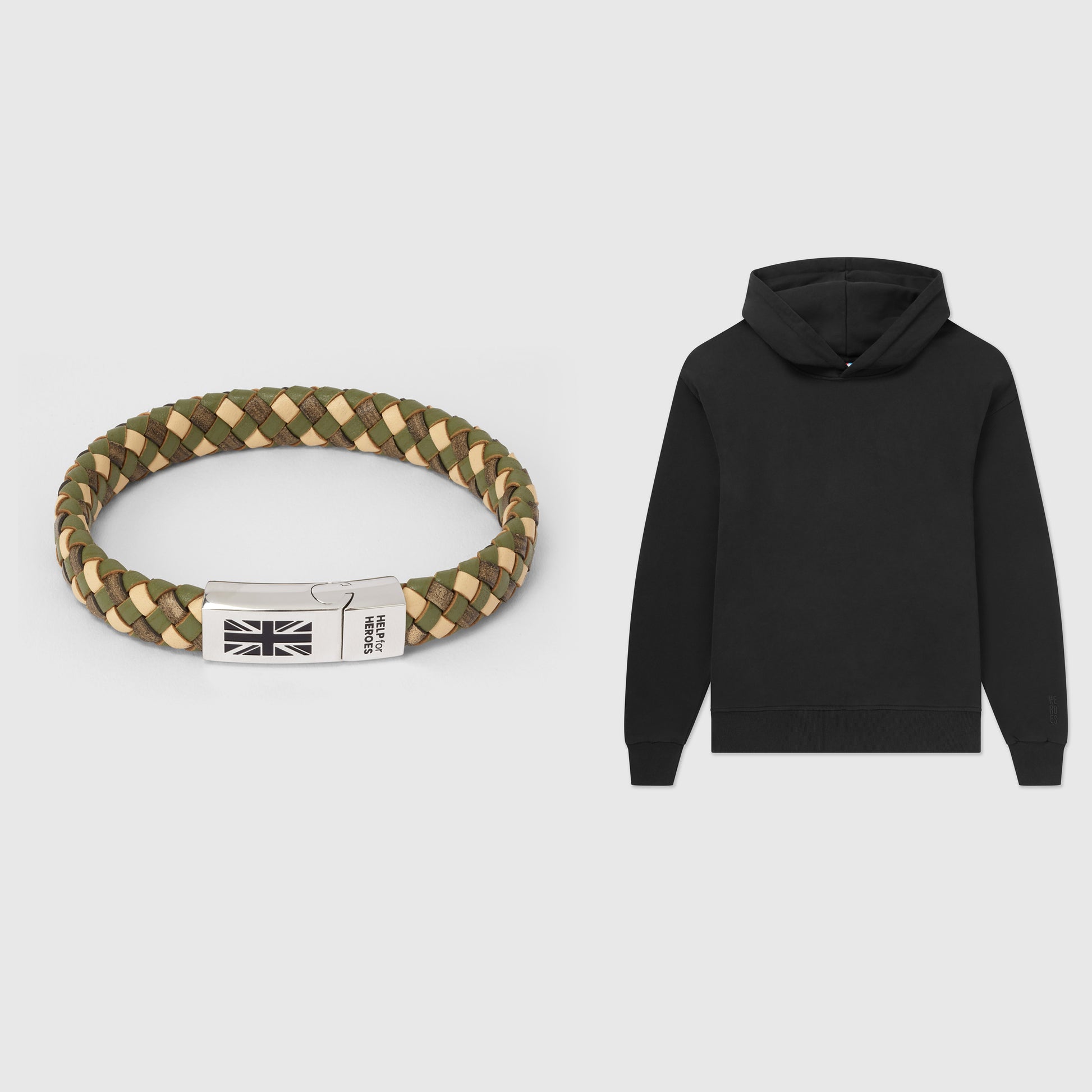 This Help for Heroes bundle combines the Essential Relaxed Heroes Hoodie Washed Black with our Camo Leather Chunky Bracelet.