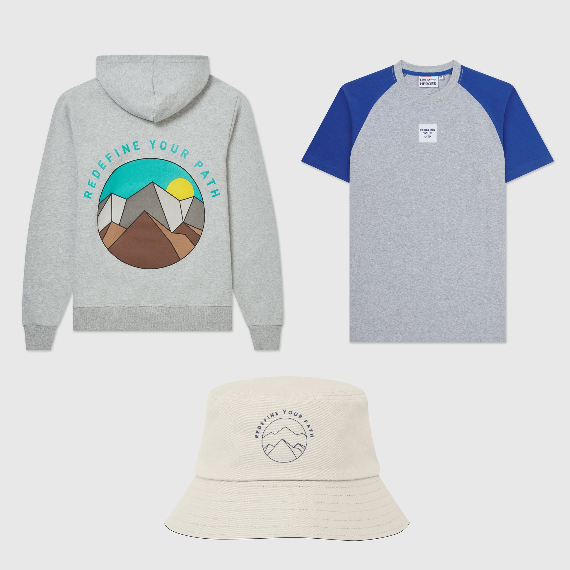 This Help for Heroes bundle includes the Your Path Contrast Sleeve T-Shirt Mid Blue, Your Path Pullover Hoodie Grey Marl and Redefine Your Path Reversible Bucket Hat Navy/Stone.