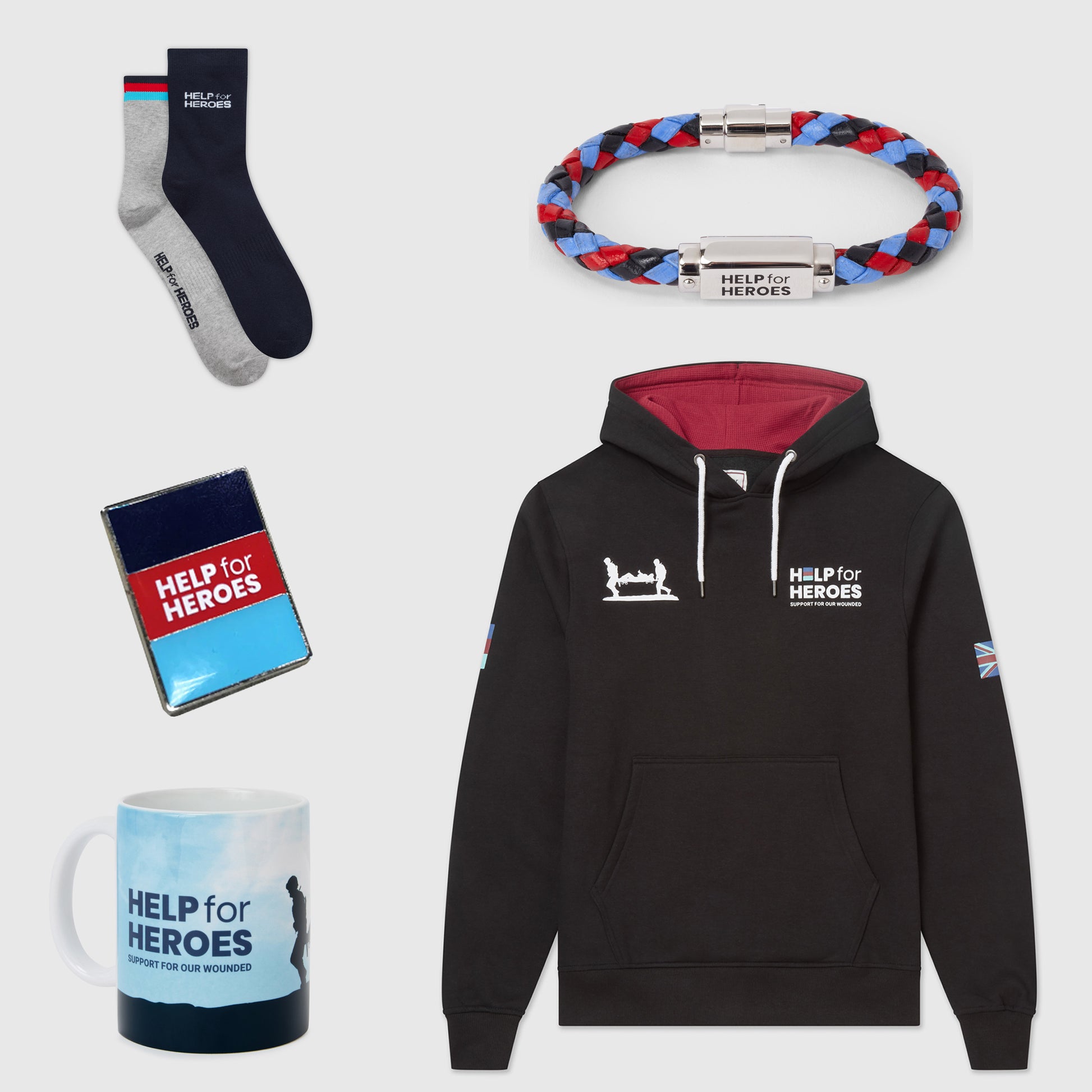 Our Help for Heroes Supporters Club Super Bundle Black includes our 2 Pk Classic Comfort Top Socks, Tri-Colour Leather ID Bar Bracelet, Classic Pin Badge, Stretcher Bearer Mug and Heritage Pullover Hoodie in Black.